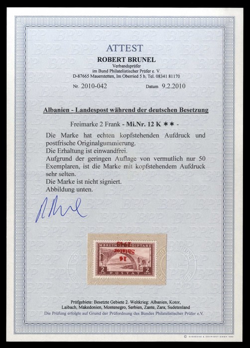 | Zusatzinformationen und Suchstichworte: | DBA Freiburg GmbH Los 1999005351 Deutsche Besetzung II. WK Albanien 1943, 2 Frank großformatige Freimarke mit der markanten Abart "kopfstehender Aufdruck" in tadelloser postfrischer Luxusqualität. Aktuelles Farbfotoattest Brunel BPP vom 9.2.2010 ohne jegliche Qualitätseinschränkung ".... Die Erhaltung ist einwandfrei. Aufgrund der geringen Auflage von vermutlich nur 50 Exemplaren, ist die Marke mit kopfstehendem Aufdruck sehr selten...". In Anbetracht der bekannten Auflagezahl erscheint der Katalogwert im Michel-Spezial 2009 erhöhenswert Festpreis 1.500,00 EUR |