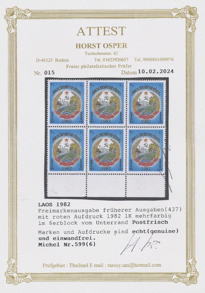 | Zusatzinformationen und Suchstichworte: | Christoph Gärtner 60. Auktion 15. Oktober 2024 Los 2604 Laos 1982 1 k. überdruckt "1982" in rot, unten Randsechserblock, postfrisch, leicht fleckig wie üblich, fein Ausruf 150,00 EUR |
