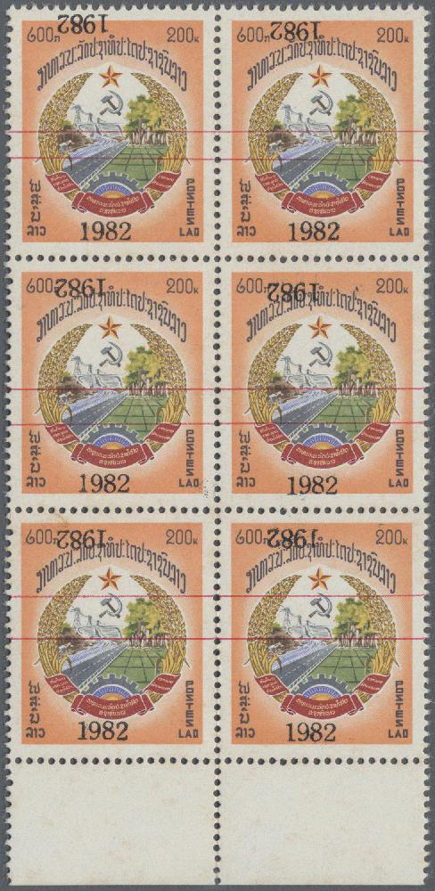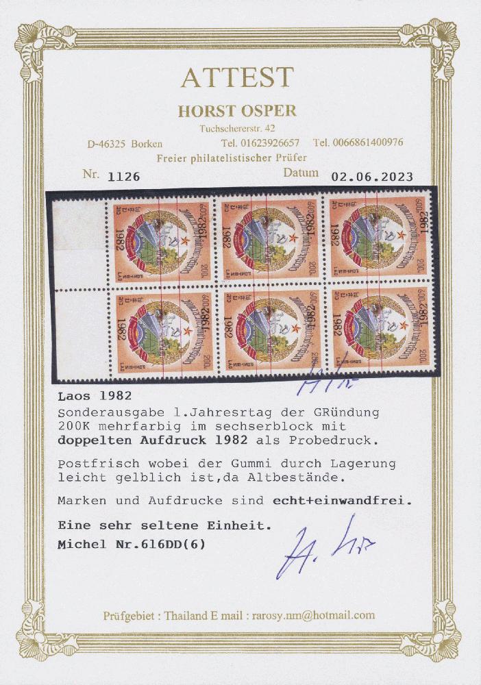 | Zusatzinformationen und Suchstichworte: | Christoph Gärtner 60. Auktion 15. Oktober 2024 Los 2615 Laos 1982 200 k. senkrechter Sechserblock mit Bogenrand unten, Überdruck "1982" Doppel-, gestempelt als Beweis, postfrisch mit leicht fleckig/getönter Gummi. Eine sehr seltene Einheit. Ausruf 140,00 EUR |