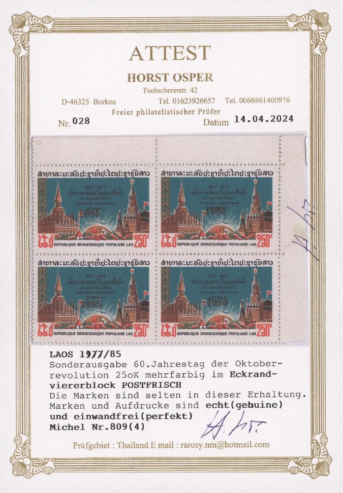 | Zusatzinformationen und Suchstichworte: | Christoph Gärtner 60. Auktion 15. Oktober 2024 Los 2619 Laos 1985 provisorisch 250 k. überdruckt "1985" in rot, Eckrandblock oben rechts mit vier, postfrisch, frisch und fein Ausruf 100,00 EUR |