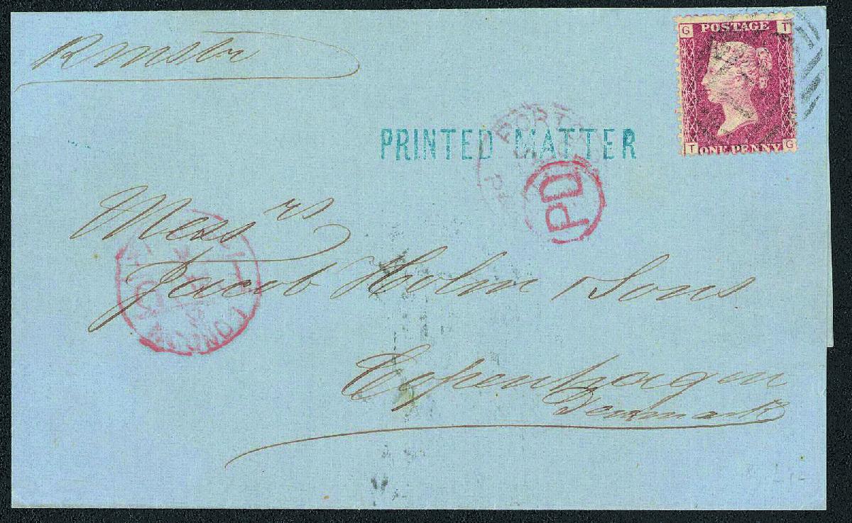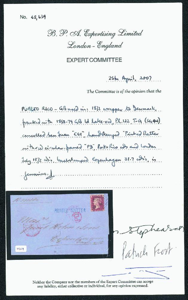| Zusatzinformationen und Suchstichworte: | Gert Müller 123. Auktion 22. August 2024 Los 2584 Puerto Rico DRUCKSACHE NACH DÄNEMARK: Grossbritannien 1 P. Königin Victoria, Platte 122, farbfrisch und tadellos als überaus seltene Drucksachen-Frankatur, aufgegeben beim britischen Postamt San Juan/Puerto Rico mit Nummernstempel "C61" nach Copenhagen/Dänemark mit beigesetztem rotem Kreisstempel "PD", sowie rotem K1 "LONDON PAID" und rückseitigen Transit- und Ankunftsstempeln. Sehr seltene Verwendungsform, insbesondere als "USED ABROAD" mit zudem für Puerto Rico extrem seltener Destination. In dieser Form möglicherweise ein Unikat! Ausruf 1.500,00 EUR |