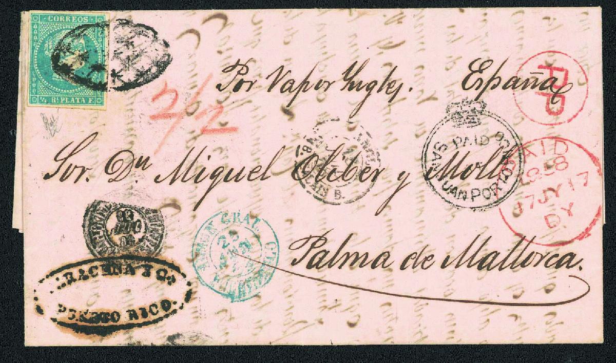 | Zusatzinformationen und Suchstichworte: | Gert Müller 123. Auktion 22. August 2024 Los 2585 Puerto Rico BRITISCHES POSTAMT IN PUERTO RICO: Spanisch-Westindien, ½ R. grünblau, Königin Isabella II., farbfrisches und perfekt gerandetes Luxusstück auf traumhaft schönem Brief mit Ovalstempel und beigesetztem K2 „PORTO RICO 28.JUN.(1858)“ an das britische Postamt in San Juan. Dort wurde der Brief nachtaxiert (2/2) und mit dem seltenen klaren Kronen-K2 „PAID SAN JUAN PORTO RICO“ versehen, sowie rotem Kreisstempel „PP“, sowie zahlreichen weiteren Transit- und Ankunftsstempeln vorder- und rückseitig mit sehr seltener Destination „PALMA DE MALLORCA“. Eine spektakuläre Teilfrankatur mit zudem noch sehr seltener Destination. Eine der attraktivsten und zugleich seltensten Teilfrankaturen des britischen Postamtes in Porto Rico. Luxus! Provenienz: Sammlung Glassco (Robson Lowe-Auktion 25. November 1969, Los 1006). Ausruf 3.000,00 EUR |