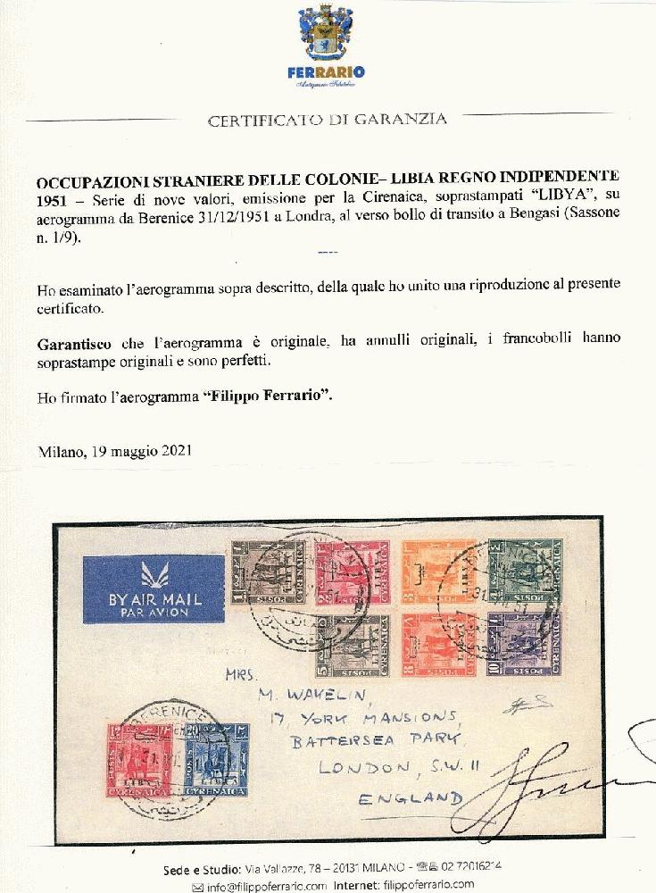 | Zusatzinformationen und Suchstichworte: | Ferrario 34. Auktion 28. September 2024 Los 2215 Libyen LIBIA REGNO INDIPENDENTE 1951 - Emissione per la Cirenaica, nove valori (1/9), perfetti, su aerogramma da Berenice 31/12/1951 a Londra, al verso bollo di transito a Bengasi. Raro uso postale Ausruf 1.500,00 EUR |