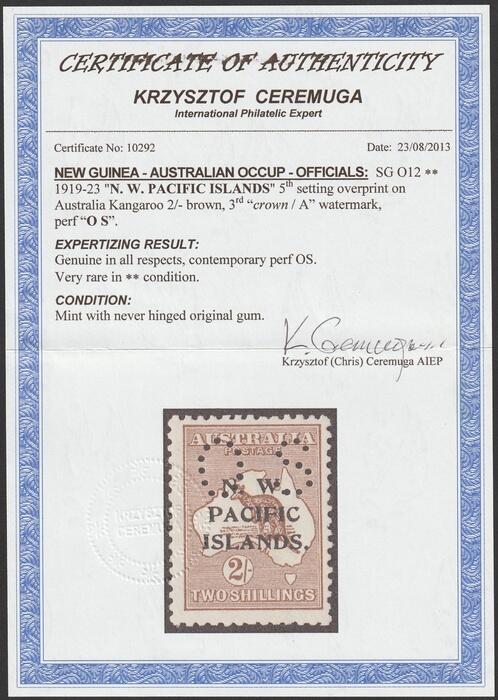 | Zusatzinformationen und Suchstichworte: | Status International Auktion 391 5. September 2024 Los 3023 Neuguinea 1919-23 Überdruck Känguruh 2/- braun, drittes Wasserzeichen, fünfter Fassung Überdruck Zähnung OS. Pracht postfrisch mit üblich sl tropicalised Gummi. SG O12 Katalogwert £950 für M, sollen sein mindestens Doppel-, £1900 postfrisch. Sehr selten echt. 2013 Ceremuga AIEP Fotoattesten (P) (Schätzpreis 1800 A$) Ausruf 1.200,00 AUD |