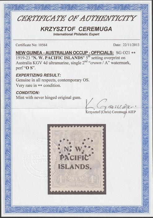 | Zusatzinformationen und Suchstichworte: | Status International Auktion 391 5. September 2024 Los 3025 Neuguinea 1919-23 Überdruck KGV 4d ultramarin, fünfter Fassung, Zähnung OS. Pracht postfrisch mit üblich sl tropicalised Gummi. SG ) 21 Katalogwert £450 für M, sollen sein mindestens Doppel-, £900 postfrisch. Selten echt. 2013 Ceremuga AIEP Foto Prüfungsbefund (P) (Schätzpreis 700 A$) Ausruf 500,00 AUS |