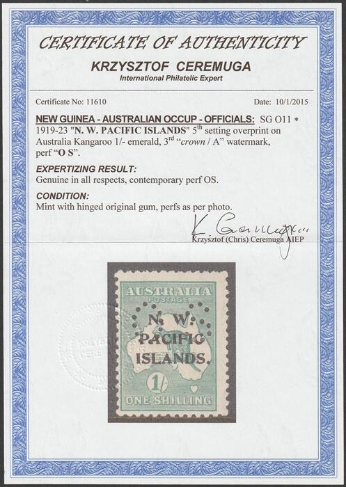 | Zusatzinformationen und Suchstichworte: | Status International Auktion 391 5. September 2024 Los 3022 Neuguinea 1919-23 Überdruck Känguruh 1/- smaragd, drittes Wasserzeichen, fünfter Fassung Überdruck Zähnung OS. Feinst bis Pracht ungebraucht leicht gefalzt mit üblich sl tropicalised Gummi. SG Katalogwert £400. selten echt. 2015 Ceremuga AIEP Fotoattesten (P) (Schätzpreis 450 A$) Ausruf 300,00 AUD |