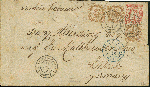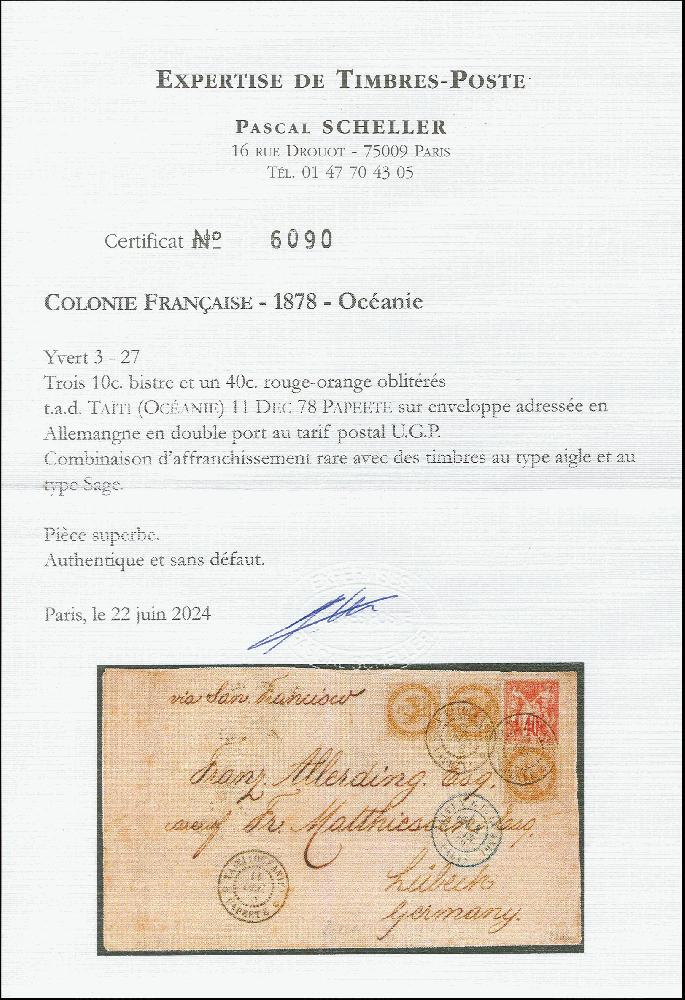 | Zusatzinformationen und Suchstichworte: | Heinrich Köhler 384. Auktion 19./20., 23. - 28. September 2024 Los 1235 Tahiti 1859, Adler 10 c. gelbbraun, senkrechtes Paar und einzeln, und Sage-Type 40 c. rotorange, ein 10 c. schmaler unten ansonsten ringsum voll- bis breitrandig, alle sauber entwertet mit Kreisdatumsstempel. "TAITI (OCÉANIE) PAPEETE 11 DEC. 78" nochmalig daneben, auf Brief nach Deutschland, Vermerk "über san Francisco" mit blau Ankunftsdatumsstempel. "TAITI V. E. U.T ANGL PARIS FEVR. 79", auf der Rückseite Ankunft. Brief geöffnet auf drei Seiten und mit Fehlern, zwei cissors Vortrennschnitt gestützt und einige Flecke, noch ein ausnahmsweise seltene Mischfrankatur Eagle-Sage von einem sehr ungewöhnlich Ursprung, portogerecht am Doppelgewichtsstufe Taxierung (Weltpostvereinstarif von erste Mai 1878) Zuschlag 3.000,00 EUR |