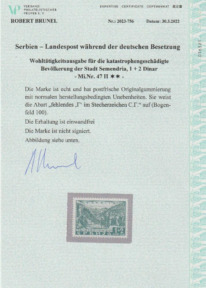 | Zusatzinformationen und Suchstichworte: | Philadria 32. Auktion 12. Oktober 2024 Los 390 Deutsche Besetzung II. WK Serbien 1941 Serbia, German Occupation. "Smederevo", 1 + 2 Din. value with constant flaw "Missing G in Engravers' Sign". Stamp is MNH of good quality with natural paper crease Ausruf 60,00 EUR |
