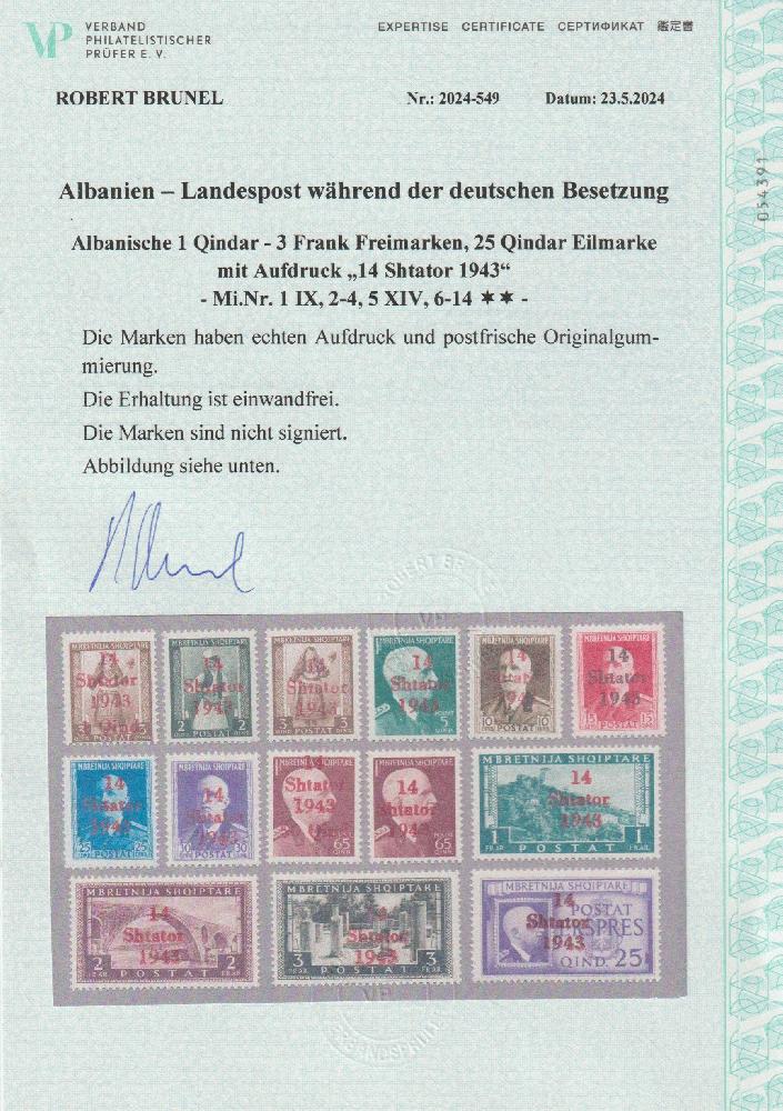 | Zusatzinformationen und Suchstichworte: | Philadria 32. Auktion 12. Oktober 2024 Los 442 Deutsche Besetzung II. WK Albanien 1943/4 Albania, German Occupation. Complete run, MNH, of good quality. Brunel certificate for overprints 1/14 Ausruf 130,00 EUR |