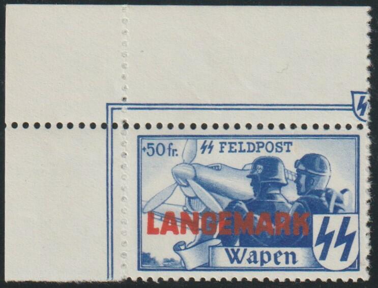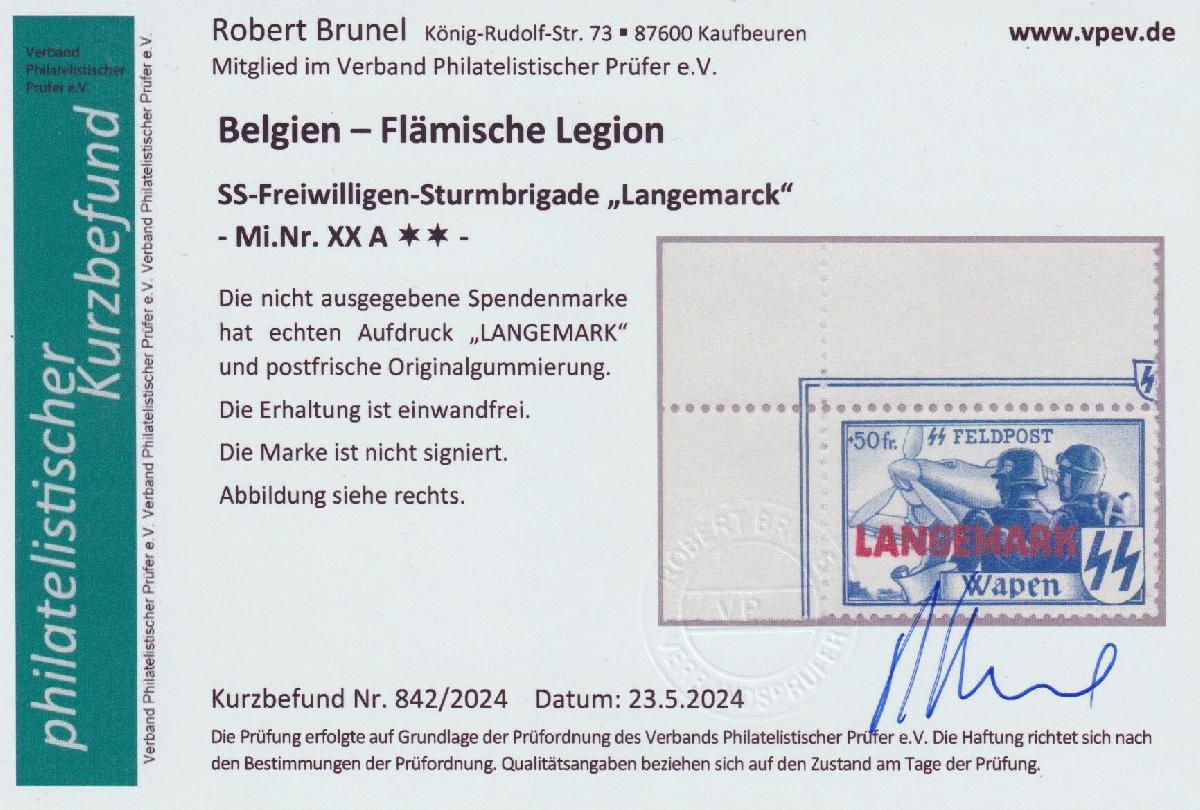| Zusatzinformationen und Suchstichworte: | Philadria 32. Auktion 12. Oktober 2024 Los 444 Deutsche Besetzung II. WK Belgien Flämische Legion 1944 Belgium, Flemish Legion. Vignette "Luftwaffe", perforated, overprinted "LANGEMARK" in red. MNH copy from left upper corner of very good quality Ausruf 50,00 EUR |