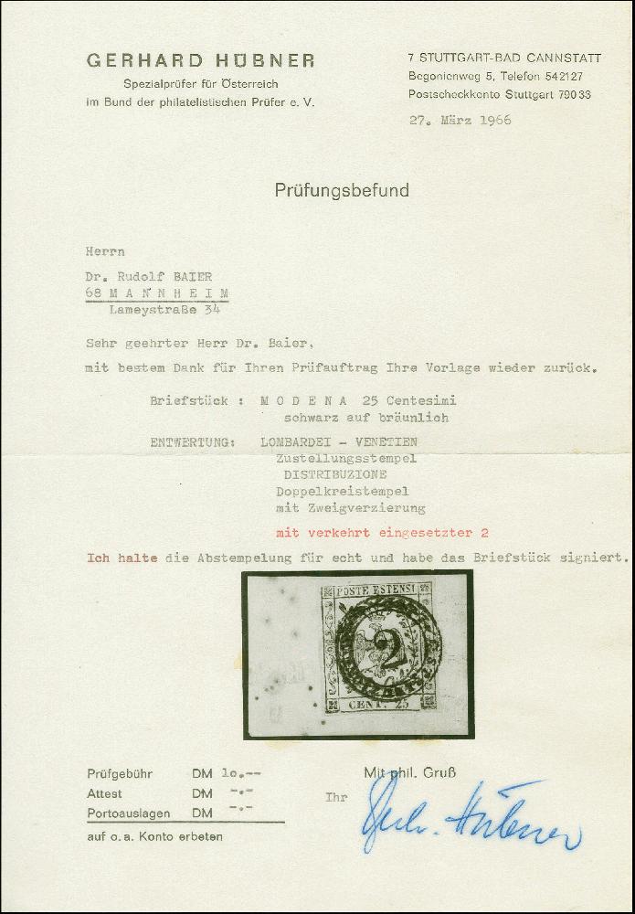 | Zusatzinformationen und Suchstichworte: | Heinrich Köhler 384. Auktion 19./20., 23. - 28. September 2024 Los 5376 Österreich Lombardei Venetien "DISTRIBUZIONE 2", klar abgeschlagen als alleinige Entwertung auf Modena 1852, 25 Centesimi auf bräunlich, allseits vollrandig, auf Briefstück (dieses etwas fleckig). Ein außerordentlich seltenes, wahrscheinlich einzig bekanntes Stück Zuschlag 400,00 EUR |