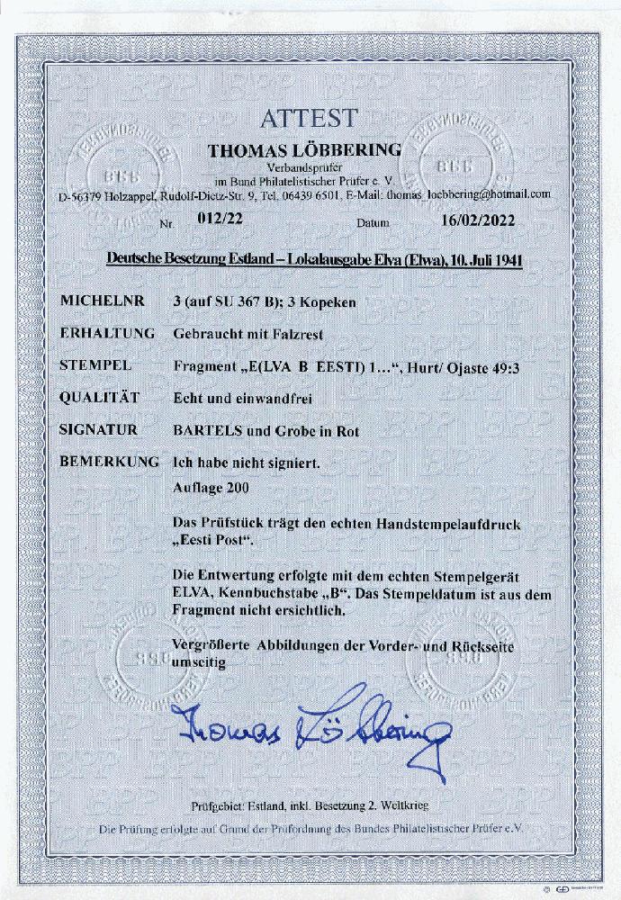 | Zusatzinformationen und Suchstichworte: | 30. Schlegel Auktionshaus Auktion Auktionstermin: 25. - 27. April 2022 Los 4077 Deutsche Besetzung II. WK Estland Elwa Ausruf 130,00 EUR |