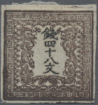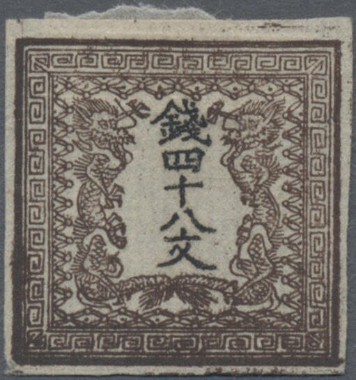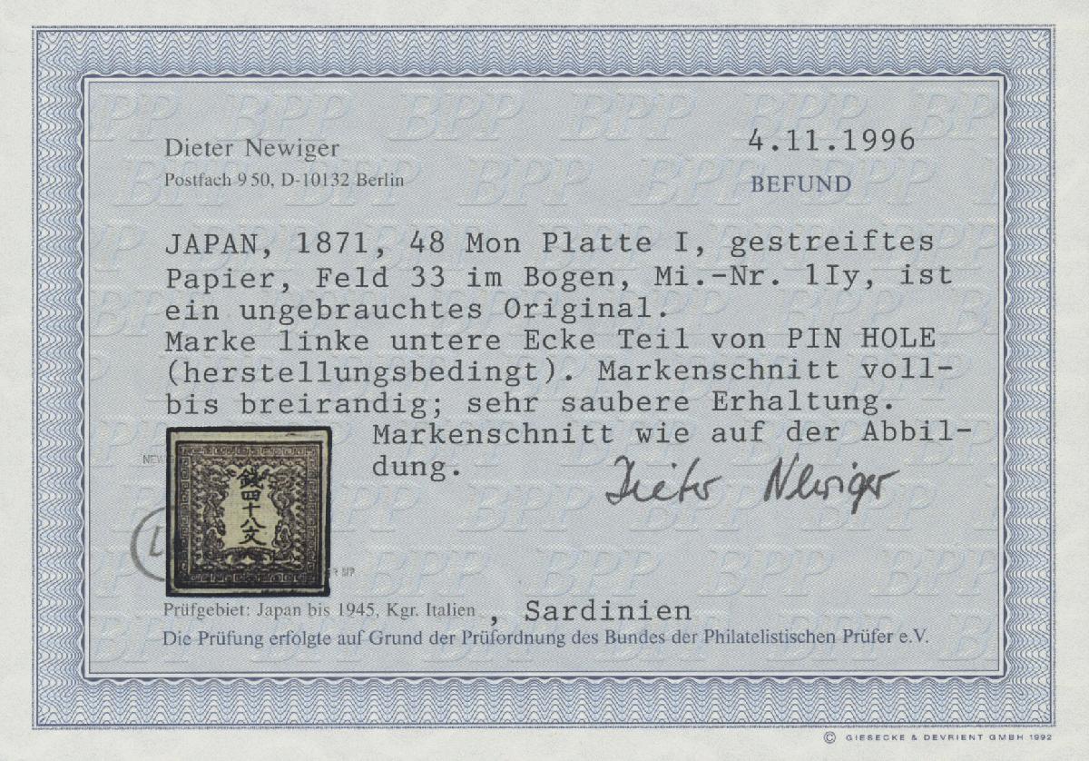 | Zusatzinformationen und Suchstichworte: | Christoph Gärtner 60. Auktion 15. Oktober 2024 Los 2316 Japan 1871, Drachen 48 mon dunkelbraun, Platte I Position 33, auf einheimischem Velinpapier (gegittertes Papier), mit Stellungs Nadelloch unten links Ecke, voll- zu breite Ränder, ungebraucht ohne Gummi, wie verausgabt Ausruf 80,00 EUR |