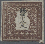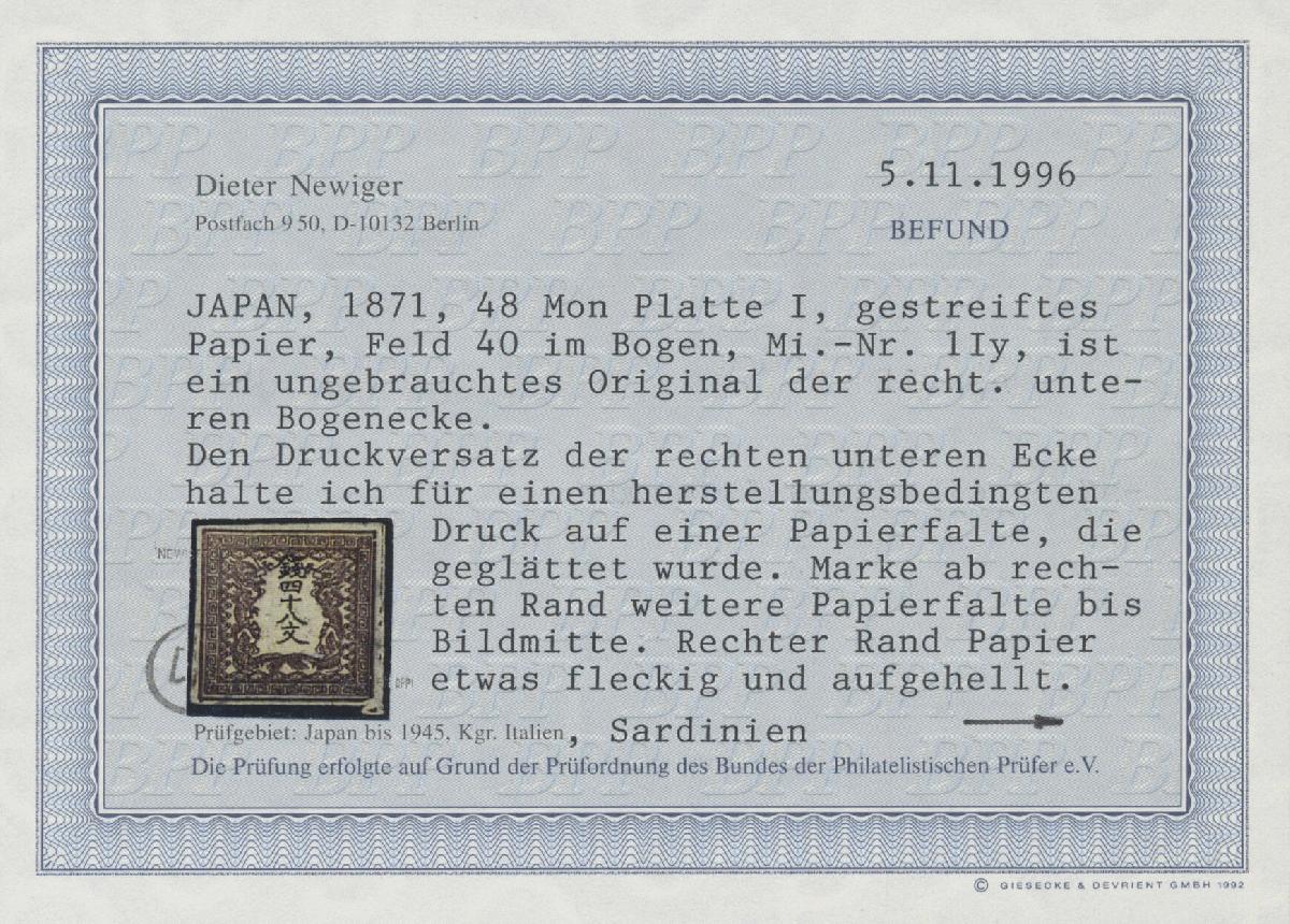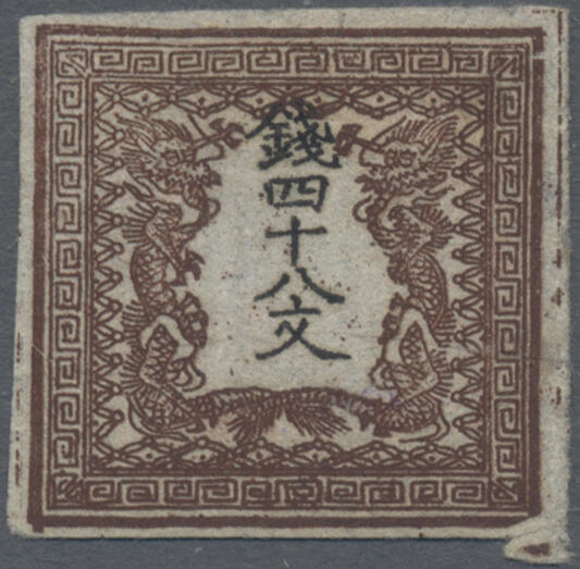 | Zusatzinformationen und Suchstichworte: | Christoph Gärtner 60. Auktion 15. Oktober 2024 Los 2318 Japan 1871, Drachen 48 mon rötlichbraun, Platte I Position 40, auf einheimischem geripptem Papier, ungebraucht ohne Gummi, wie verausgabt, interressant Papierfalten rechte untere Ecke Ausruf 90,00 EUR |