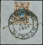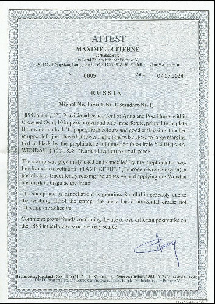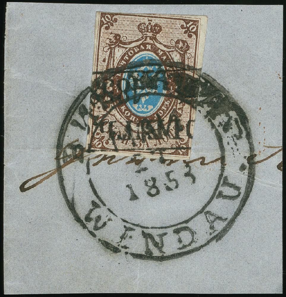 | Zusatzinformationen und Suchstichworte: | Heinrich Köhler 384. Auktion 19./20., 23. - 28. September 2024 Los 1428 Russland 10 k. braun/blau ungezähnt, Platte II, frische Farben und gute Prägung, berührt oben links, rasiert unten rechts, ansonsten schmale bis breite Ränder, entwertet mit zweisprachigem Zweikreis "WENDAU ( ) 27 1858" auf kleinem Briefstück, sowie vorher gestempelt mit dem eingerahmt Entwertung "TAUROGEN", etwas hell ohne Bedeutung, Querbug außerhalb des Markenbereiches, noch schön und sehr selten Postbetrug Zuschlag 360,00 EUR |