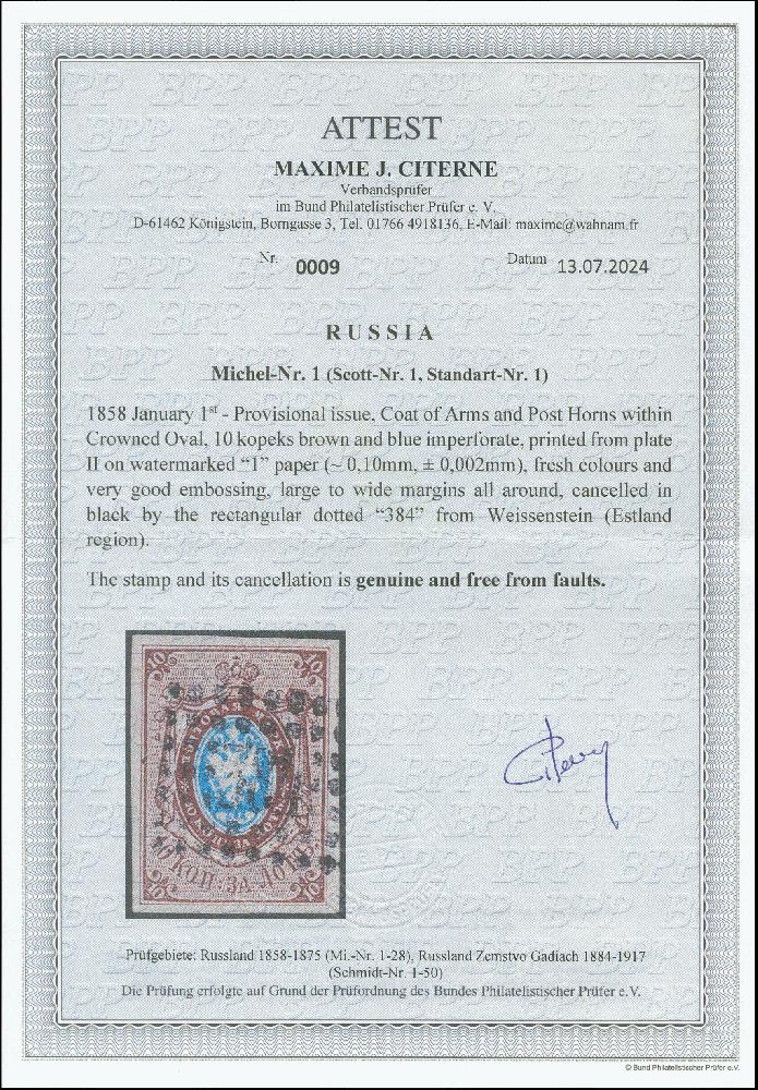 | Zusatzinformationen und Suchstichworte: | Heinrich Köhler 384. Auktion 19./20., 23. - 28. September 2024 Los 1422 Russland 10 k. braun/blau ungezähnt, Platte II, frisch collours und sehr gute Prägung, große zu ringsum breitrandig, gebraucht mit Rahmen punktierter "384" WEISSENSTEIN, ein sehr gut erhaltene Marke Zuschlag 420,00 EUR |