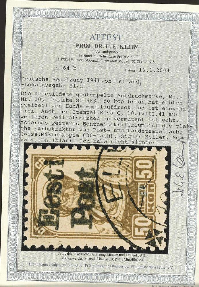 | Zusatzinformationen und Suchstichworte: | Gert Müller 114. Auktion Auktionstermin: 25. Mai 2022 Los 3183 Deutsche Besetzung II. WK Estland Elwa 50 Kop. braun mit Handstempelaufdruck "EESTI POST", farbfrisch und sauber gest. "ELVA". Eine sehr seltene Ausgabe mit einer Auflage von lediglich 200 Stück. Im Michel deutlich unterbewertet! Fotoattest "ECHT UND EINWANDFREI" Prof. Dr. Klein BPP. Ausruf 700,00 EUR |