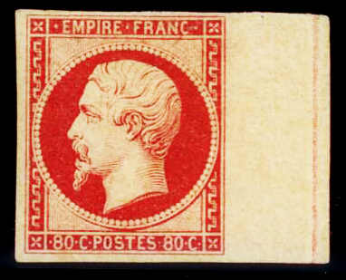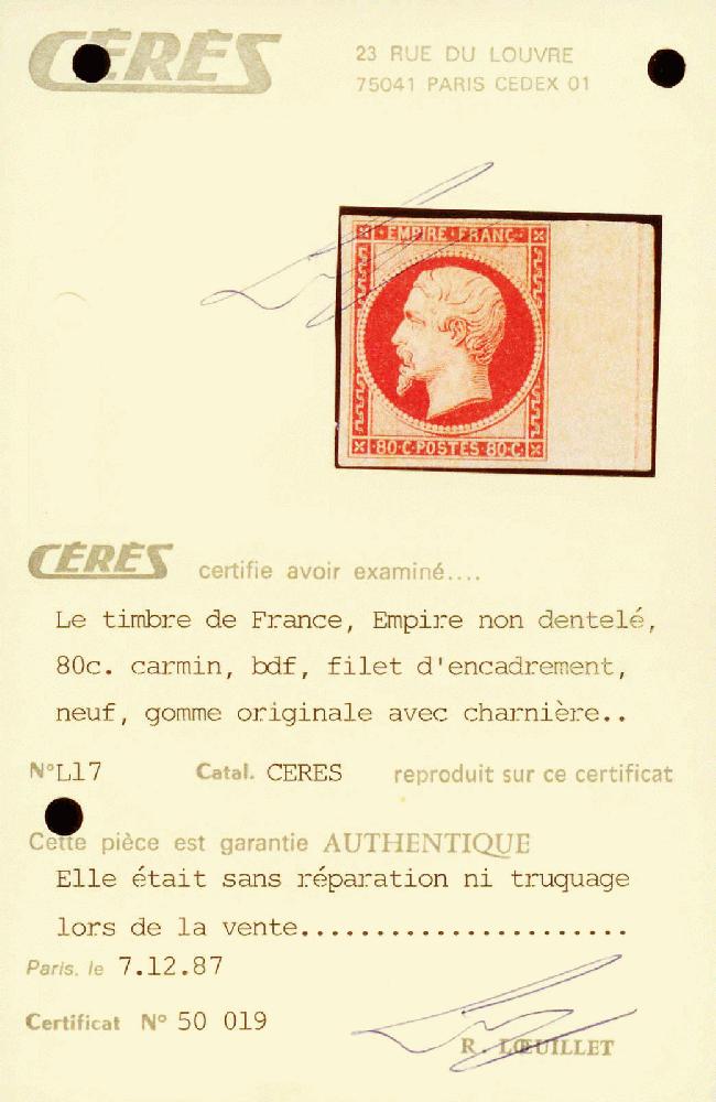 | Zusatzinformationen und Suchstichworte: | Galerie Dreyfus - Frankreich Raritäten Los 30 Frankreich Empire ungezähnt 1853 80c. carmin, bord de feuille avec filet d'encadrement neuf avec gomme. Rarissime et TB. Certificat Loeuillet Festpreis 10.000,00 CHF |