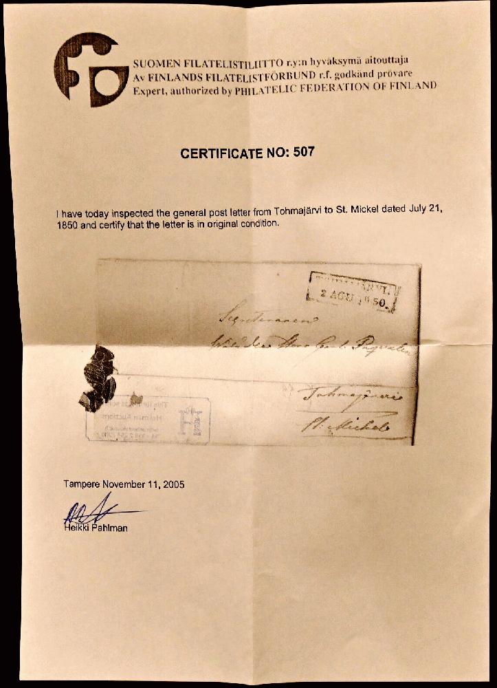 | Zusatzinformationen und Suchstichworte: | Hellman 133. Auktion 9. - 12. Oktober 2024 Los 2390 Finnland Tohmajärvi 1850 on a fine letter to Mikkeli, contents included. A fine letter! Ausruf 80,00 EUR |