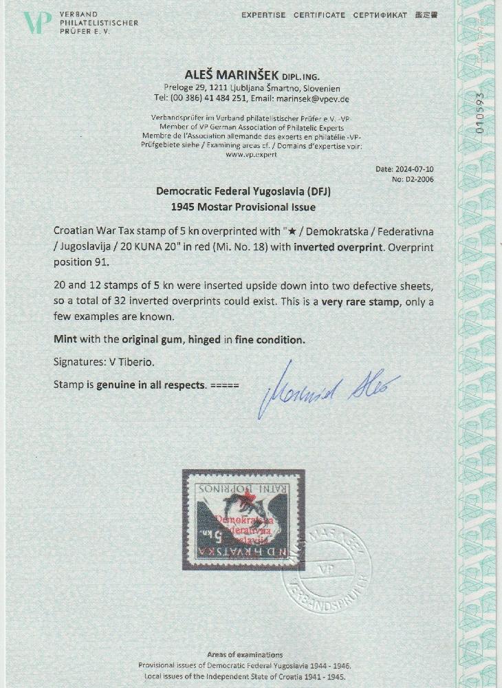 | Zusatzinformationen und Suchstichworte: | Philadria 32. Auktion 12. Oktober 2024 Los 304 Jugoslawien Volksrepublik Bosnien u. Herzegowina 1945 Bosnia, Mostar Provisional Issue 1945. Kn. 20,00 on Kn. 5,00 stamp with inverted overprint. Stamp has hinge remnant and two brown spots. Rare stamp, only 32 were overprinted Ausruf 60,00 EUR |
