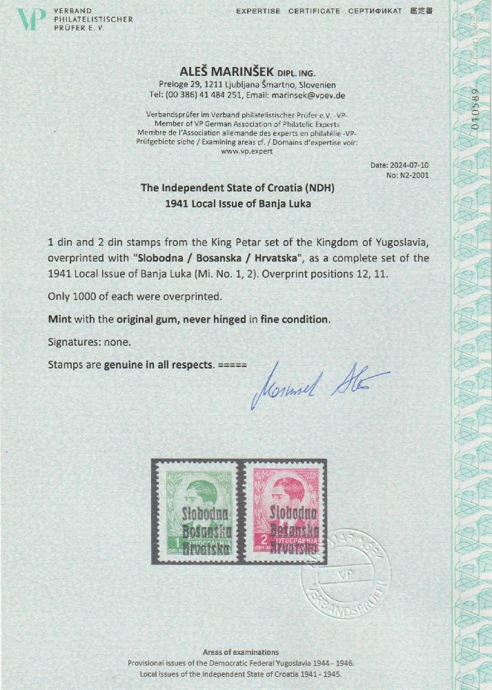 | Zusatzinformationen und Suchstichworte: | Philadria 32. Auktion 12. Oktober 2024 Los 320 Kroatien 1941 Banja Luka. Both values, MNH of good quality. Din. 2,00 stamp with minimal scuff in hair. Ausruf 320,00 EUR |
