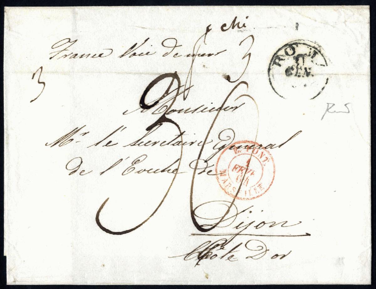 | Zusatzinformationen und Suchstichworte: | Viennafil 90. Live-Auktion 4. - 6. Juni 2024 Los 160 Italien Staaten Kirchenstaat 1864, piego di lettera (di tre porti) in porto dovuto del 30.1.1864 da Roma a Dijon (Francia), indicazione manoscritta "France Voie de mer", trasportata con il vapore francese "Hermus" da Civitavecchia a Marseille e via terra a Dijon; bollo rosso "E.-PONT. MARSEILLE, 1 FEVR. 64"; annotazione "3" (tre porti) e tassa manoscritta "30" (dec.) con sopra "f chi 3" Ausruf 80,00 EUR |