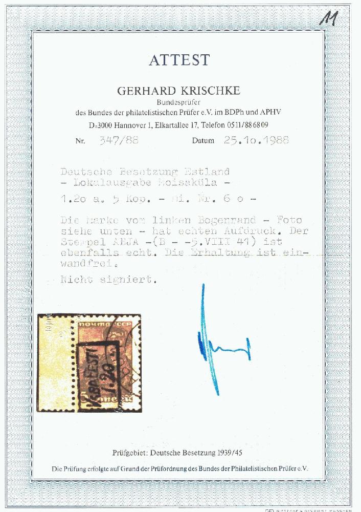 | Zusatzinformationen und Suchstichworte: | 112. Kirstein-Larisch Auktion Auktionstermin: 9. - 11. Juni 2022 Los 1045 Deutsche Besetzung II. WK Estland Moisek 1941, Werktätige, 1.20 auf 5 K. bräunl'rot, Handstempelaufdruck "VABA EESTI", Prachtstück v. li. Rand mit K2 "ABJA (B 5.VIII 41)", Fotoattest Krischke Ausruf 100,00 EUR |