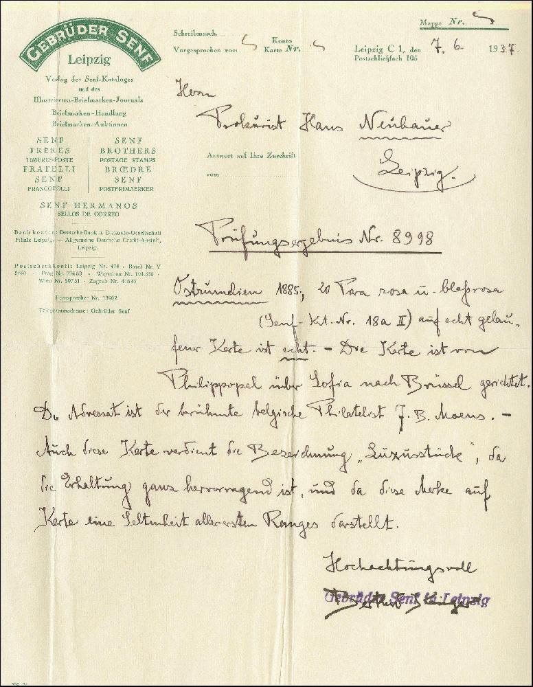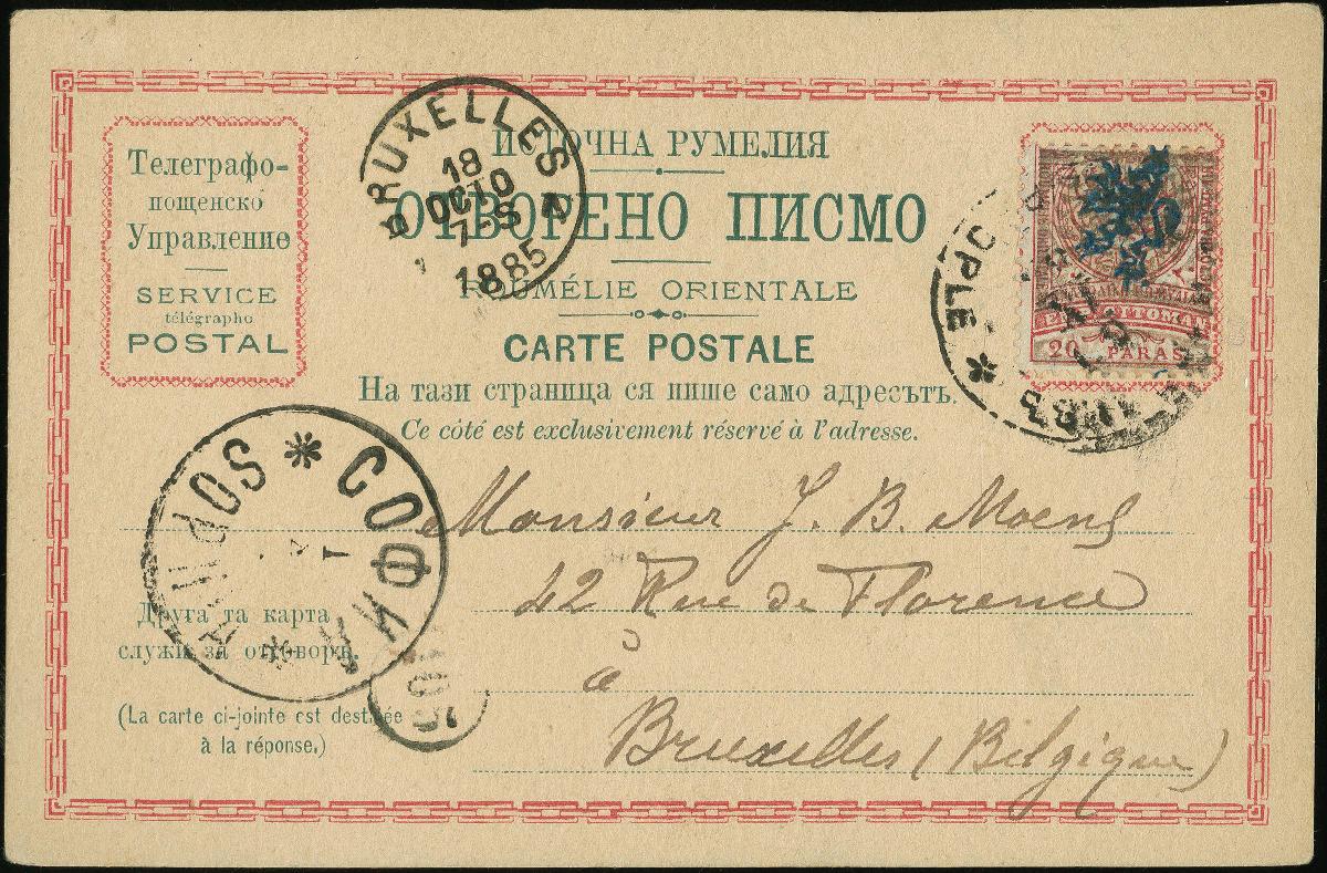 | Zusatzinformationen und Suchstichworte: | Heinrich Köhler 384. Auktion 19./20., 23. - 28. September 2024 Los 1180 Ostrumelien 1885 (30 September), 20pa rosa auf hellrosa, gezähnt 11,5, Aufdruck-Type II in blau, entwertet auf Postkarte zu prominente philatelist J. B. Moens in Brüssel bei Plovdiv Datumsstempel, Sofia (Oct 1) Transit und Brüssel Datumsstempel Empfänger (Oct 18) beide Abschlag auf Vorderseite, eine seltene Karte, gestempelt auf die Finaltag von Gültigkeit davon provisorische Überdrucke Ausruf 150,00 EUR |