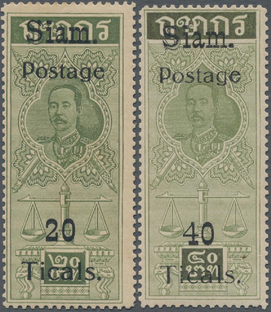 | Zusatzinformationen und Suchstichworte: | Christoph Gärtner 60. Auktion 15. Oktober 2024 Los 2766 Thailand 1907 "Siam/Porto" überdruckt Fiskalmarken 20t. Auf 20t. Und 40t. Auf 40t. Beide ungebraucht kleiner Falz mit großem Teil Originalgummi, die 20t. Signiert "Gebr. Senf/Leipzig" und mit K. Ceremuga Attest, die 40t. Signiert "GMÄHLE BPP" und mit Siam Briefmarke Comm. Ausruf 2.000,00 EUR |