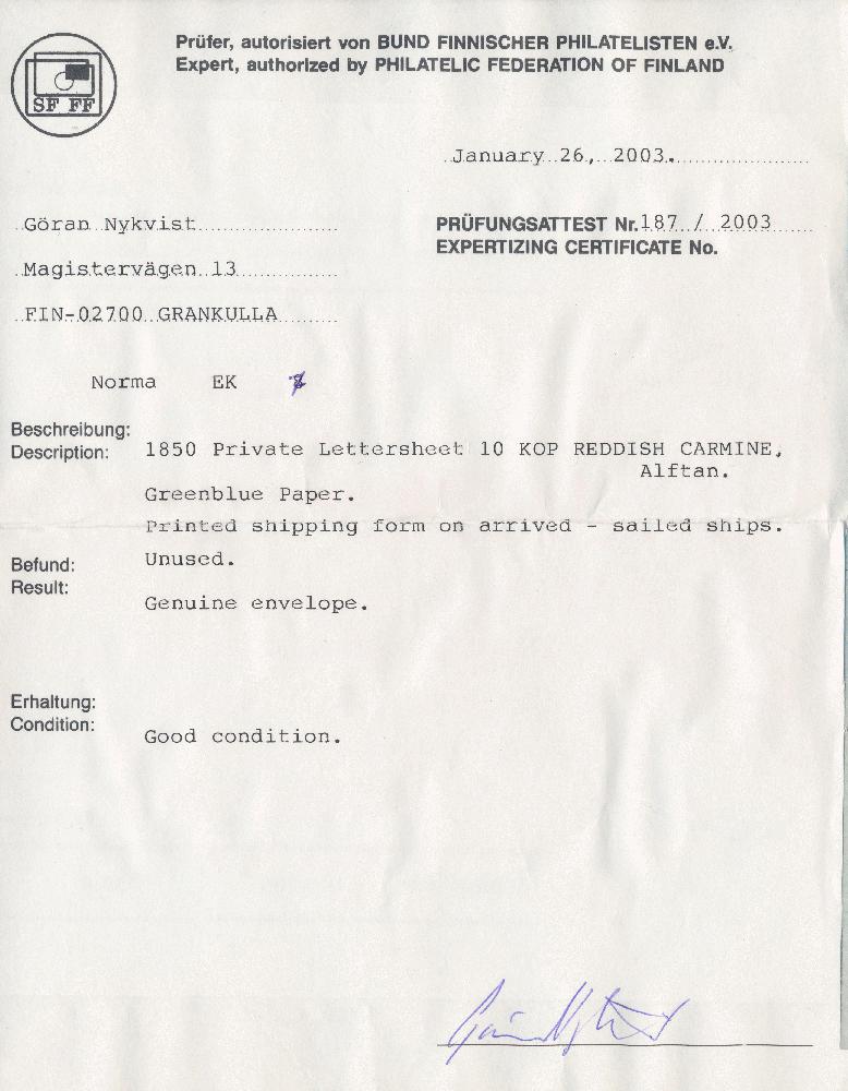 | Zusatzinformationen und Suchstichworte: | Postiljonen 242. & 243. Int. Briefmarken Auktion 24. - 27. September 2024 Los 969 Finnland Unused 10 kopek letter sheet on green blue paper with privately printed list for arriving and departing ships. (Norma EK7 Bx). F=20.000. Ex. Schlesinger and Fabergé. Cert. Göran Nykvist Ausruf 400,00 EZR |