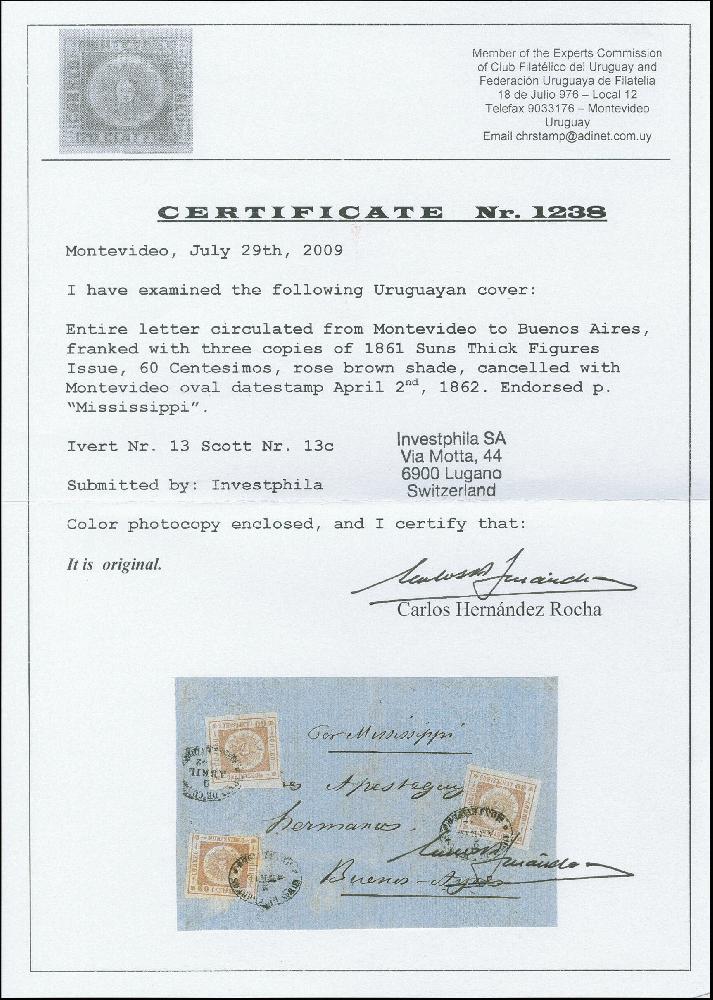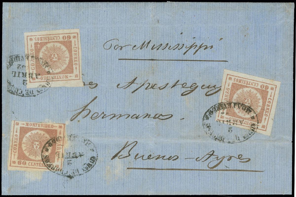 | Zusatzinformationen und Suchstichworte: | Heinrich Köhler 384. Auktion 19./20., 23. - 28. September 2024 Los 1762 Uruguay 1860, dicke Ziffern 60 c. matt graulila, drei einzeln Stücke mit meist breitrandig, entwertet mit Montevideo Kreisdatumsstempel. Auf vollständigem Brief zu Buenos Ayres, Vermerk Par Mississippi. Beförderte des Flußes Platte Linie. Eine Briefmarke wird gekreuzt von Registraturbug, berührt nicht die gute Wirkung von dieser seltenen Brief. Ausruf 750,00 EUR |