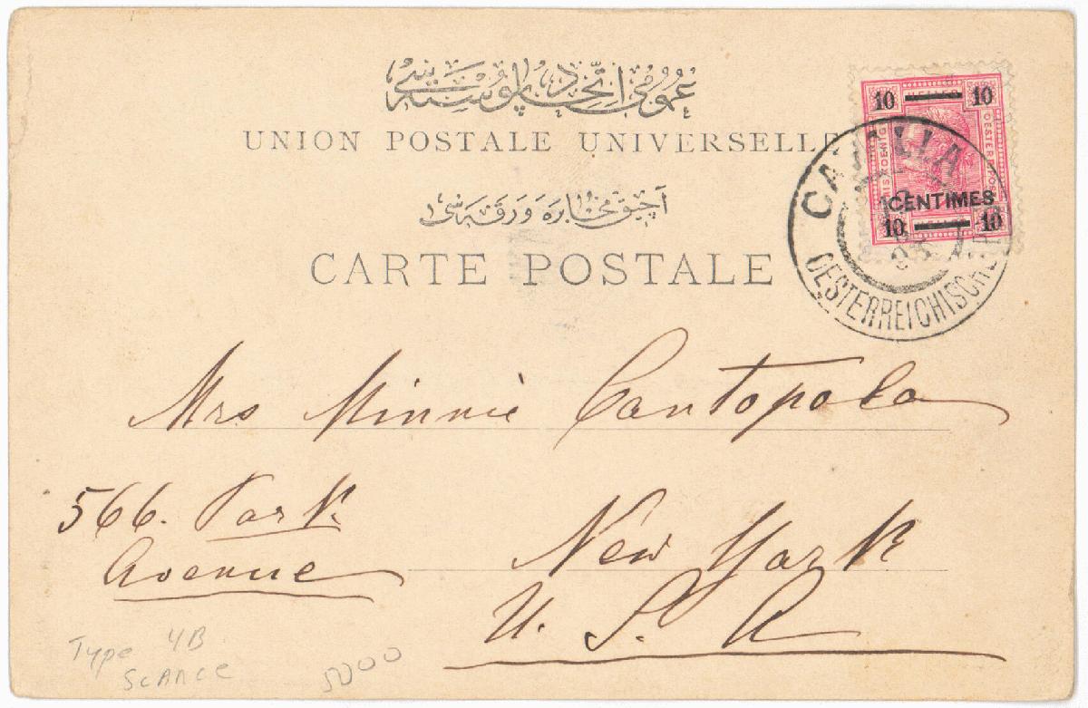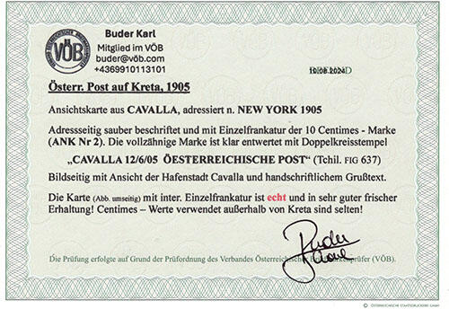 | Zusatzinformationen und Suchstichworte: | Merkurphila 60. Auktion 3. - 4. Oktober 2024 Los 726 Österreich Post in der Levante Österr. Post in der Levante, 1905, CAVALLA, sitzender klarer Abschlag auf 10 CENTIMES - Marke Nr 2, als Einzelfrankatur einer Ansichtskarte, adressiert n. NEW YORK, seltenes Prachtstück! Ausruf 140,00 EUR |