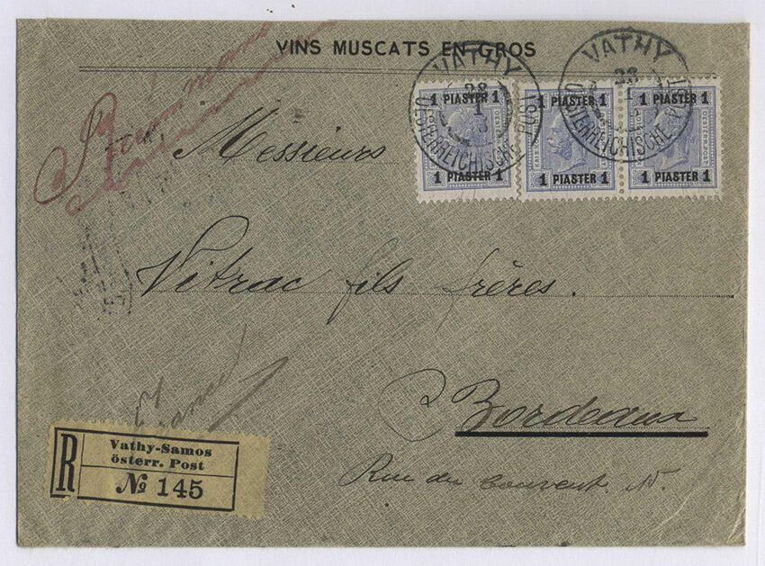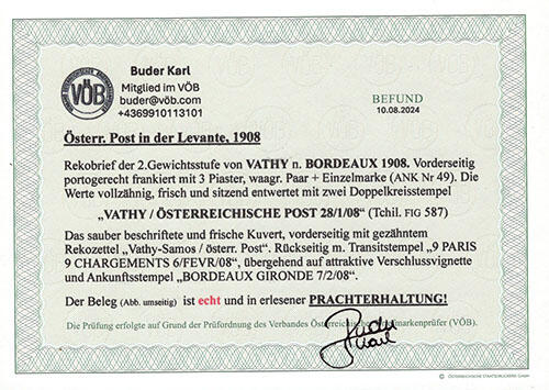 | Zusatzinformationen und Suchstichworte: | Merkurphila 60. Auktion 3. - 4. Oktober 2024 Los 720 Österreich Post in der Levante Österr. Post in der Levante, 1900, VATHY - BORDEAUX, frischer REKOBRIEF der. 2 Gewichtsstufe, vorderseitig frankiert mit 3 x 49 (Einzelmarke + waag. Paar), sauber entwertet VATHY / ÖSTERREICHISCHE POST 28/1/08, Rekozettel "VATHY-SAMOS", rückseitig mit Ankunftsstempel, PRACHTERHALTUNG Ausruf 120,00 EUR |