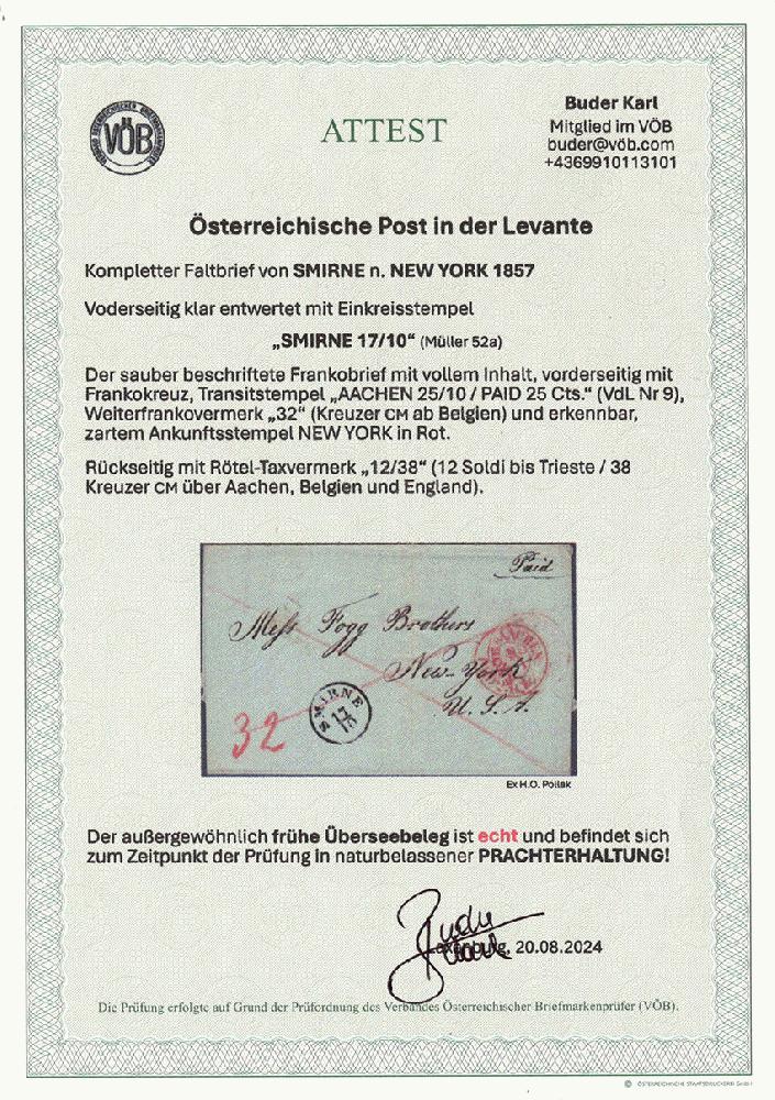 | Zusatzinformationen und Suchstichworte: | Merkurphila 60. Auktion 3. - 4. Oktober 2024 Los 440 Österreich Post in der Levante Österr. Post in der Levante, 1857, SMIRNE - NEW YORK, seltener Übersee - Auslandsbrief aus der Levante, vorderseitig mit klarem Aufgabestempel "SMIRNE 17/10", Transitstempel AACHEN und Ankunftsstempel NEW YORK in rot, Weiterfrankovermerk "32", rückseitig mit Frankovermerk, seltenes Belegstück in Prachterhaltung! Ausruf 600,00 EUR |