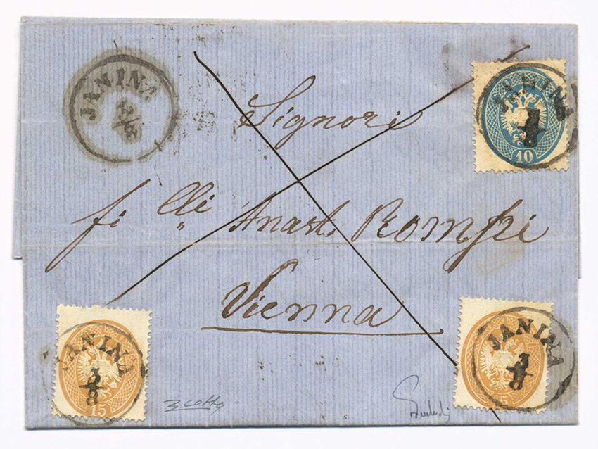 | Zusatzinformationen und Suchstichworte: | Merkurphila 60. Auktion 3. - 4. Oktober 2024 Los 443 Österreich Post in der Levante Österr. Post in der Levante, 1864, JANINA, jeweils aufrecht sitzender Abschlag seltener 40 Soldi - Buntfrankatur mit V 17 + V 18 (2) der Ausgabe 1863 mit enger Zähnung, die vollzähnigen und prägefrischen Werte dekorativ in drei Ecken des sauber beschrifteten nach WIEN geklebt, in der linken oberen Ecke ein Leerabschlag des Einkreisstempels vom 3/8 (1864), der frische Faltbrief vorderseitig zusätzlich mit Frankokreuz versehen, rückseitig mit Ankunftsstempel WIEN und Taxe der Briefgebühr, ein wirkungsvolles, naturbelassen frisches PRACHTSTÜCK dieses seltenen Vorläuferbeleges aus der Levante Ausruf 900,00 EUR |