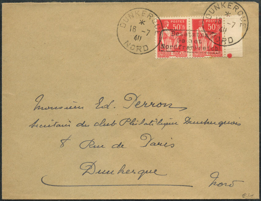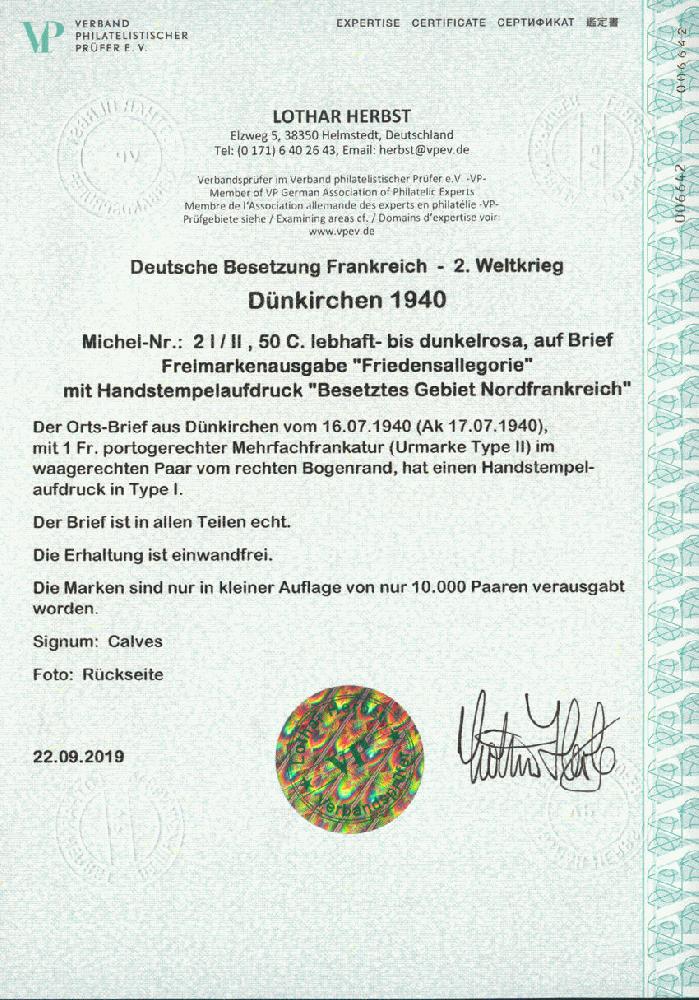 | Zusatzinformationen und Suchstichworte: | 10. Freimarke Monatsauktion - Schwerpunkt Österreich u. Deutschland Auktionstermin: 21. Mai 2022 Los 312 Deutsche Besetzung II. WK Frankreich Dünkirchen Deutsche Besetzung, Frankreich, DÜNKIRCHEN, interessanter Ortsbrief, portogerecht frankiert mit MiNr 2 I/II, als waagrechtes Paar vom rechten Rand mit Handstempelaufdruck 'BESETZTES GEBIET NORDFRANKREICH' in Type I, entwertet mit Tagesstempel 'DUNKERQUE 16.7.1940, rückseitig mit Ankunftsstempel, tadellose Prachterhaltung! Attest Herbst Ausruf 100,00 EUR |