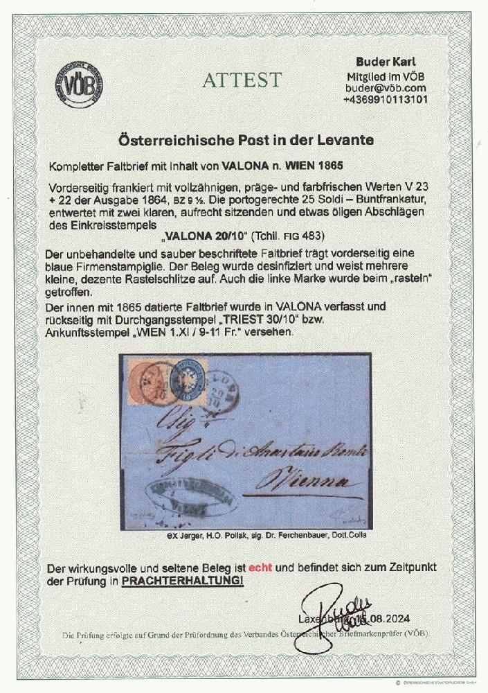 | Zusatzinformationen und Suchstichworte: | Merkurphila 60. Auktion 3. - 4. Oktober 2024 Los 444 Österreich Post in der Levante Österr. Post in der Levante, 1865, VALONA, zwei aufrecht sitzende klare Abschläge auf vollzähnigen, farb- und prägefrischen Werten Nr V 23 + 22, auf sauber beschriftetem Faltbrief mit Inhalt nach WIEN 1864, vorder- und rückseitig mit kaum sichtbaren Rastelschlitzen der Desinfektion, rückseitig mit Ankunftsstempel WIEN, besonders frischer erlesener PRACHTBELEG Ausruf 800,00 EUR |