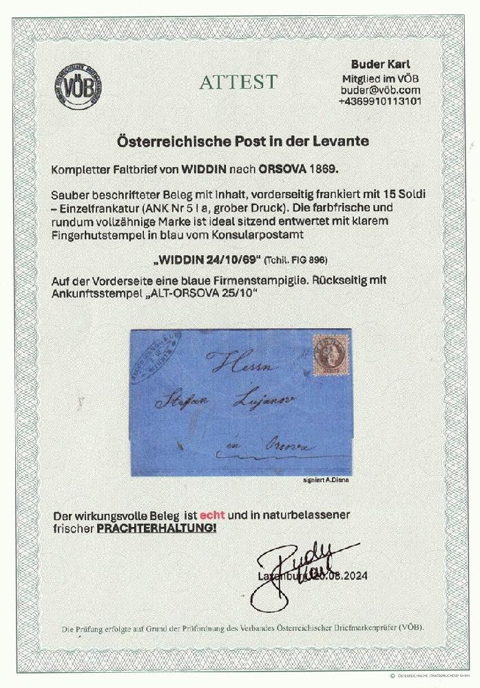 | Zusatzinformationen und Suchstichworte: | Merkurphila 60. Auktion 3. - 4. Oktober 2024 Los 698 Österreich Post in der Levante Österr. Post in der Levante, 1869, WIDDIN, perfekt sitzender und klarer Abschlag des Fingerhutstempels in BLAU "WIDDIN 24/10/69" auf vollzähniger frischer Nr 5 I, die Einzelfrankatur auf frischem Faltbrief n. ALT-ORSOVA, rückseitig Ankunftsstempel, naturbelassen frisches PRACHTSTÜCK Ausruf 300,00 EUR |