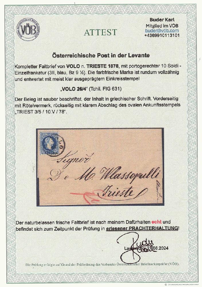 | Zusatzinformationen und Suchstichworte: | Merkurphila 60. Auktion 3. - 4. Oktober 2024 Los 707 Österreich Post in der Levante Österr. Post in der Levante, 1878, VOLO, kompletter klarer Abschlag auf Nr 4 I, als EF auf taufrischem Faltbrief n. TRIEST, rückseitig Ankunftsstempel, erlesenes P! Ausruf 180,00 EUR |