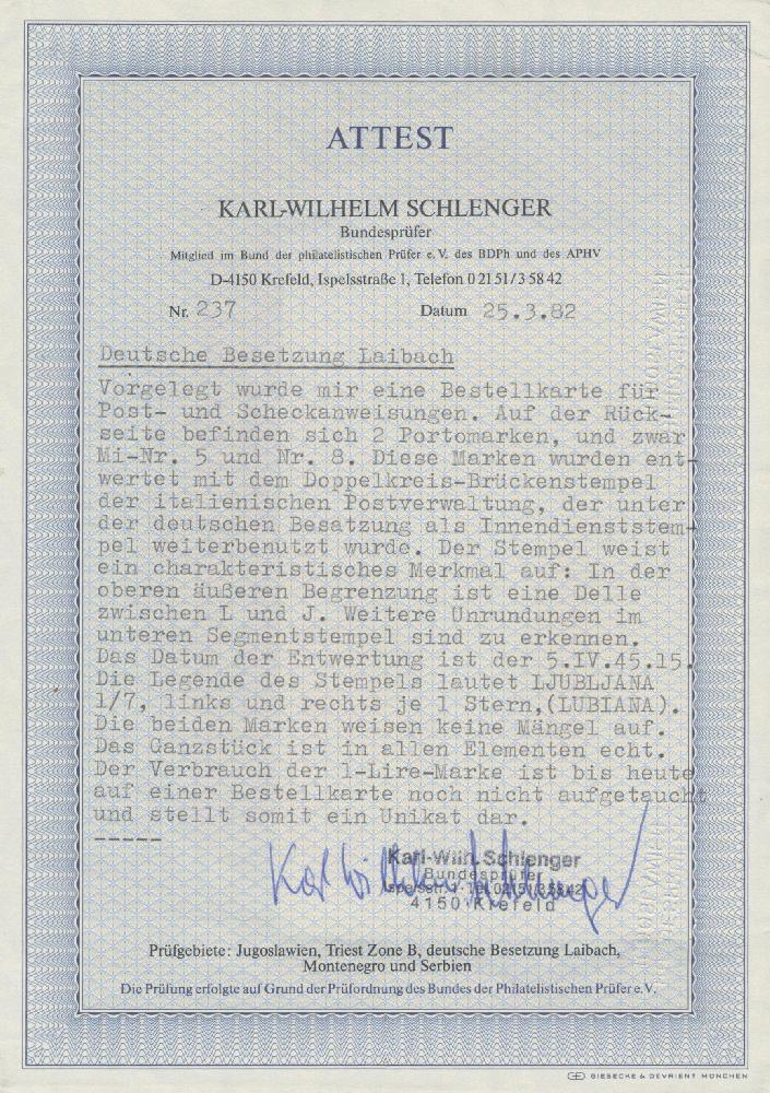 | Zusatzinformationen und Suchstichworte: | Christoph Gärtner 60. Auktion 16. Oktober 2024 Los 7542 Deutsche Besetzung II. WK Laibach 1945, 1 Lire rotorange zus. mit 50 C. dunkelviolett rs. auf Bestellkarte für Postanweisungen, klar entwertet "LJUBLJANA 1 5.IV.45". Signiert sowie Fotoattest Schlenger BPP (1982). Sehr seltene bedarfsmäßige Verwendung des 1 Lire-Wertes, zum Zeitpunkt der Attesterstellung als "Unikat" bezeichnet. (M) Ausruf 1.000,00 EUR |