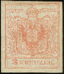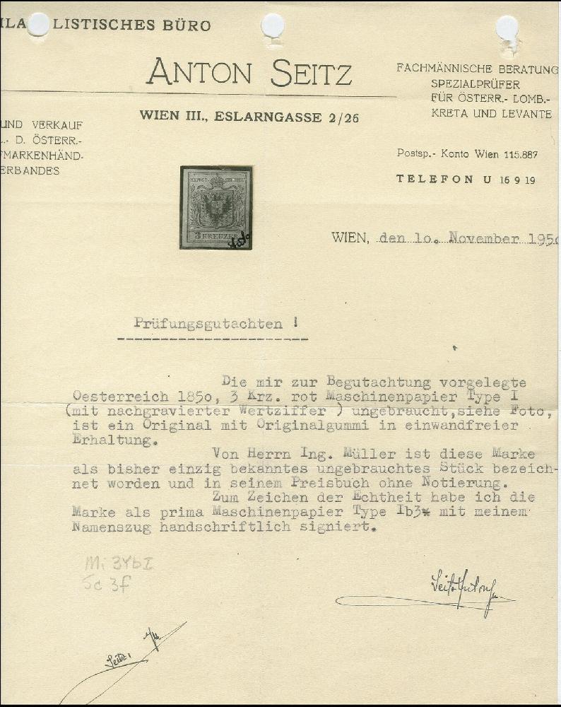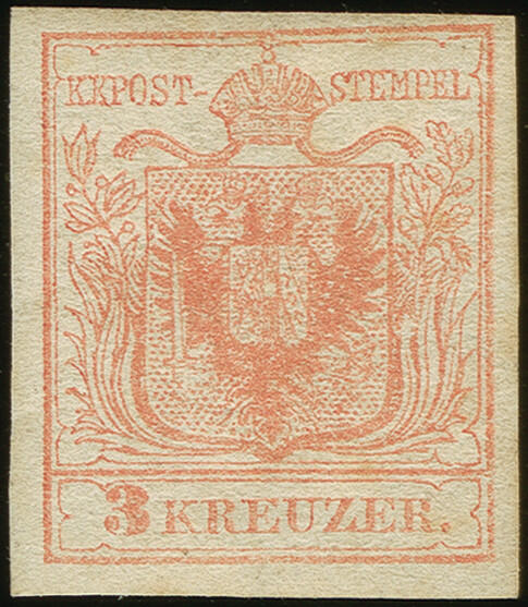 | Zusatzinformationen und Suchstichworte: | Heinrich Köhler 384. Auktion 19./20., 23. - 28. September 2024 Los 8331 Österreich 3 Kreuzer tomatenrot, Gravurtype 1-2, farbfrisch und voll- bis breitrandig, ungebraucht mit großen Teilen des Originalgummis. Schöne und einwandfreie Erhaltung. In ungebrauchter Erhaltung außerordentlich selten; PROFI hat nur ein weiteres Stück registriert Ausruf 1.500,00 EUR |
