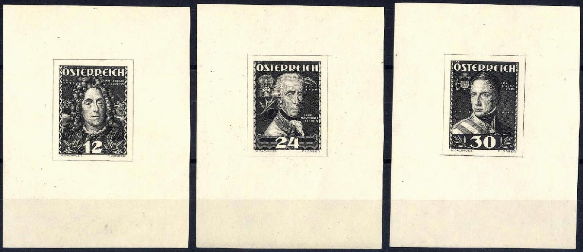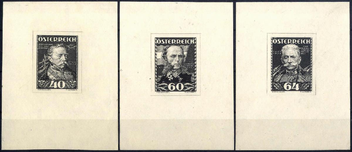 | Zusatzinformationen und Suchstichworte: | Viennafil 90. Live-Auktion 4. - 6. Juni 2024 Los 1447 Österreich 1. Republik 1935, Österreichische Heerführer, komplette Serie 6 Werte in ungezähnten Einzelabzügen in schwarz auf Kartonpapier ohne Gummi wie hergestellt Zuschlag 1.400,00 EUR |