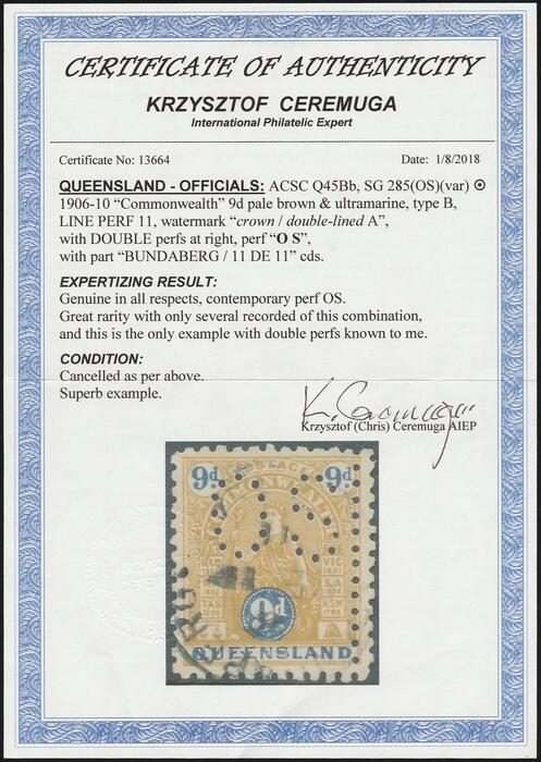 | Zusatzinformationen und Suchstichworte: | Status International Auktion 391 5. September 2024 Los 1615 Queensland 1906-10 Commonwealth 9d hellbraun und blau, Linienzähnung 11, Zähnung OS, Wasserzeichen Krone doppellinig ein, mit Doppel- Zähne rechts. Gestempelt, Pracht, Bundaberg Kreisdatumsstempel. ACSC Q45Bb (var) Katalogwert $1500 + +, plus Zuschlag für Doppelzähnung Fehler. SG 285 (OS) Katalogwert £800 für Normal und viel under- katalogisiert, Zähnung OS nicht verzeichnet und sollen sein mindestens Doppel-, £1600 +, plus Zuschlag für Doppelzähnung Fehler. Äußerst seltene Zähnung OS als nur mehrere verzeichnet - eine der vorhergehend wir angeboten verkauft für $4000 + Kommission in unser Versteigerung 318, während die Doppelzähnung Fehler ist die einzig bekannte und geglaubt einzigartig. Ausruf 1.000,00 AUD |