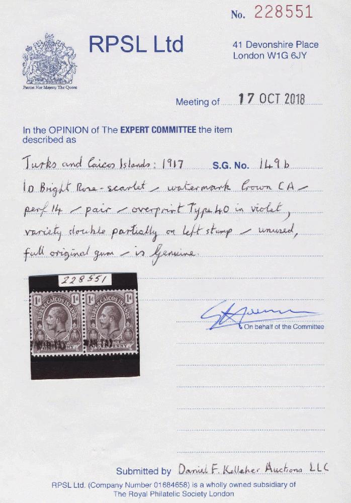 | Zusatzinformationen und Suchstichworte: | 26. classicphil GmbH Auktion 4. November 2024 Los 1345 Turks und Caicos Inseln 1919,1 d., lebhaftrosa purpurrot, Paar, Doppel- Kriegssteuer Überdruck auf linker Marke, Mult Krone CA Wasserzeichen, Zähnung 14, großer Teil Originalgummi postfrisch, Prüfungsbefund RPSL, frisch und gesucht, Pracht! Schätzpreis 150 EUR. Ausruf 40,00 EUR |