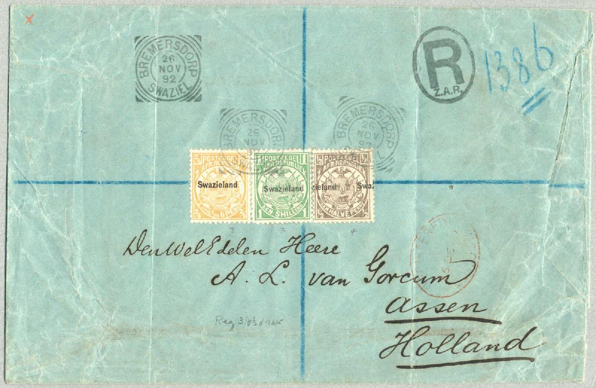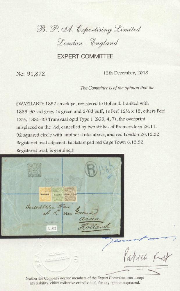 | Zusatzinformationen und Suchstichworte: | 26. classicphil GmbH Auktion 4. November 2024 Los 1293 Südafrika 1892,1/2 d/grau, 1 s/grün/Zähnung 12 1/2 x 12 und 2/6 d/gelbbraun Transvaal mit Aufdruck-Type I SWAZILAND in schwarz, missplaced auf die 1/2 d, alle entwertet mit glasklar Abschläge von BREMERSDORP 26,11,92, daneben mit addional Abschlag oben und rot LONDON/Einschreiben oval daneben gesetzt, rückseitig gestempelt mit rotem Kapstadt 6,12,92 Einschreiben oval, außerordentlich selten Brief, nur einige Einschreibeumschläge bekannt, taxiert mit ein Faktor von 40 bei SG, sehr attraktiv und frisch, perfekt für die Ausstellung Sammler, mit Prüfungsbefund BPA, Kabinett! Schätzpreis 30,000 EUR. Ausruf 6.000,00 EUR |