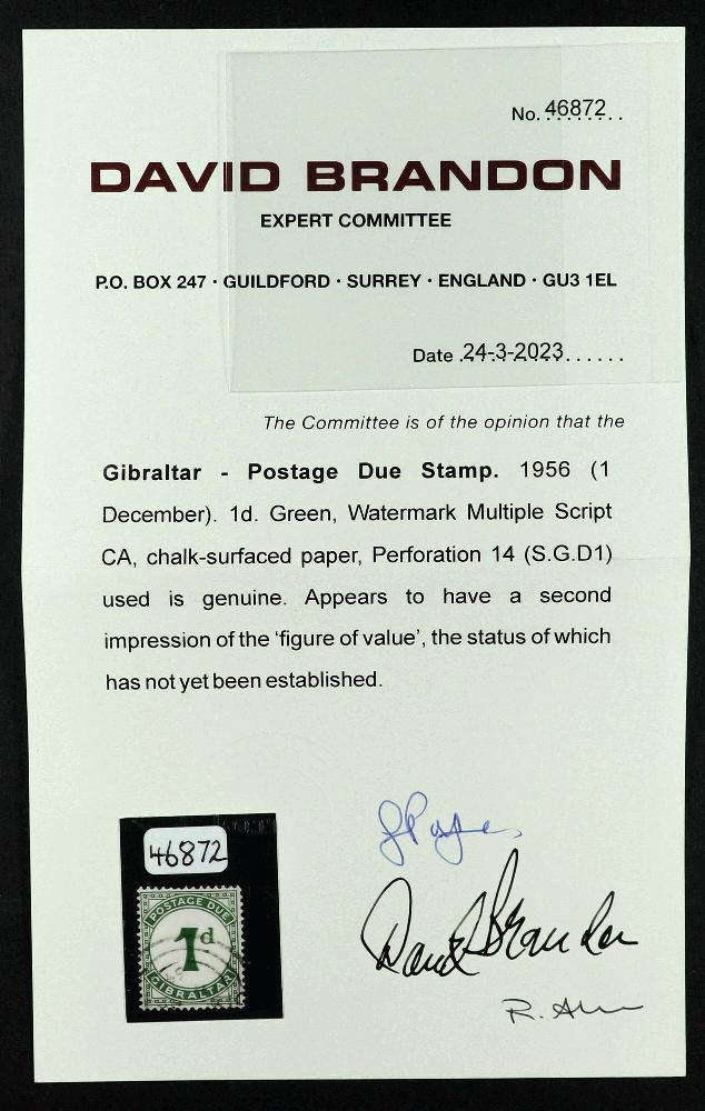 | Zusatzinformationen und Suchstichworte: | Cheshire Stamp Auction - #8365 - Public Auction 12. - 14. September 2024 Los 728 Gibraltar GIBRALTAR Nachgebühr 1956 1d grün mit "1d" Doppeldruck, SG D1 Abart, Pracht Kreisdatumsstempel gebraucht, mit 2023 David Brandon Foto-Zertifikat bestätigt " ...appears bekommen ein zweiter Prägung des Zeichen von Wert, die Stati von denen hat noch nicht gewesener bestehend. "dies ist die Entdeckung Exemplar Ausruf 400,00 GBP |