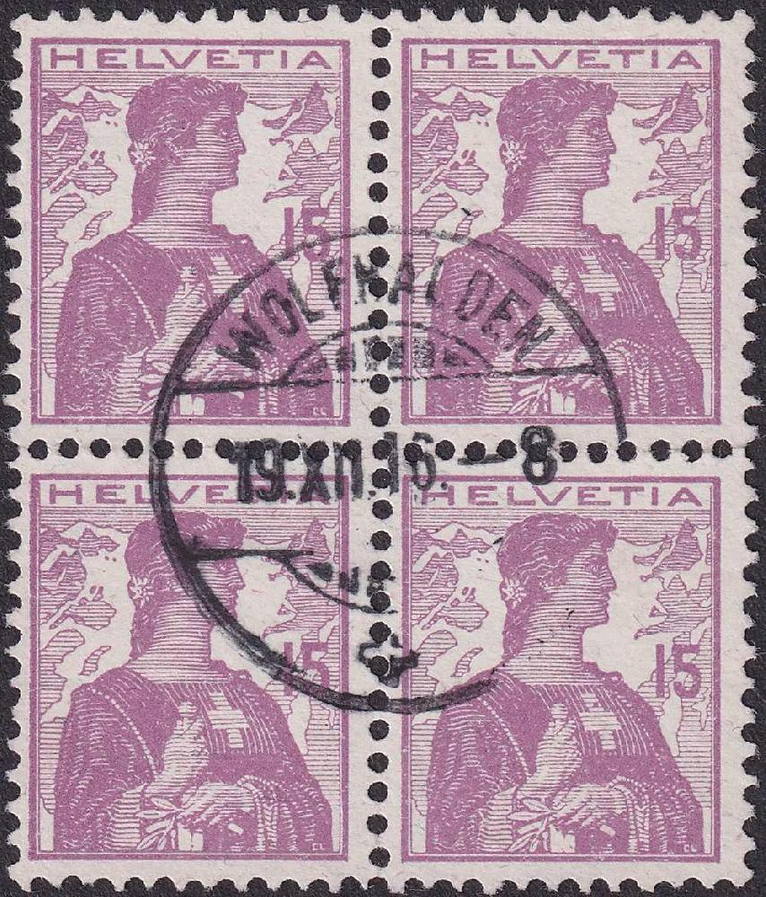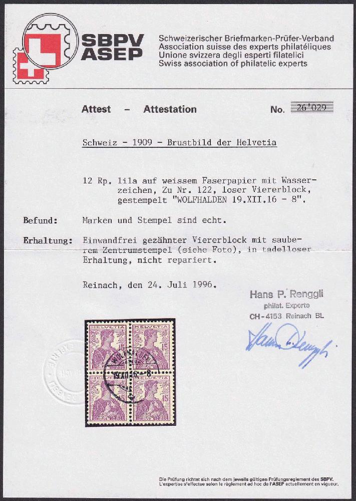 | Zusatzinformationen und Suchstichworte: | Luzernerraute Webshop Los 0004101989 Kanton Appenzell 1909, Nr.122 (Mi:116) Viererblock von WOLFHALDEN AR, in tadelloser Erhaltung, Attest Renggli (1996), SBK: 600.-+ Festpreis 220,00 CHF |