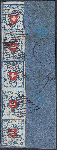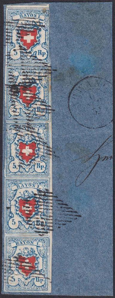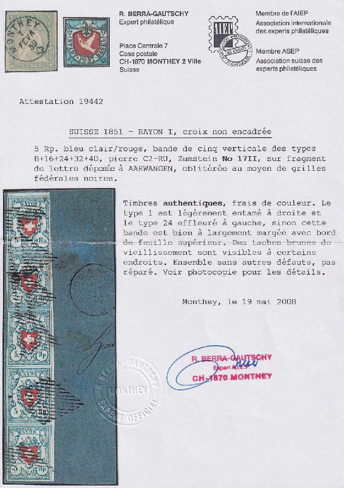 | Zusatzinformationen und Suchstichworte: | Luzernerraute Webshop Los 0000201223 Kanton Aargau AARWANGEN 1852. 17II T.8+16+24+32+40 (Fünfer-Streifen) C2-RU, grösste mögliche, senkrechte Einheit der 17II. Gruppen-Druck-Abstand oben mit Trennlinie des oberen Typen 40! Sehr guter Schnitt für diese besonders seltene Einheit. Type 8 scheint tangiert - jedoch wurde der Bogen nicht vom "Pöstler" beschnitten, sondern von der Druckerei in dieser Form schon verschnitten so herausgegeben - was der oben nach LINKS versetzte Gruppenabstand sehr schön aufzeigt (Bild 2). Mit Rauten übergehend-O, unteren Typen besonders gut erhalten. Auch Plattenfehler rechts im Rand (T.40) stempelfrei zu sehen. Attest Berra (2008) Festpreis 3.800,00 CHF |