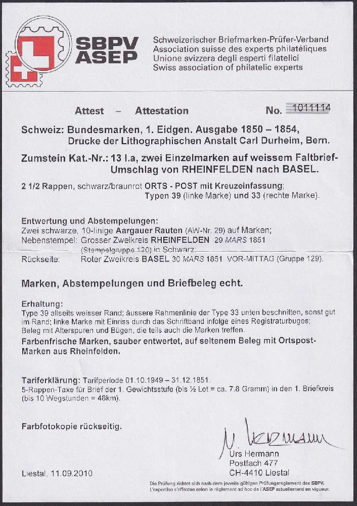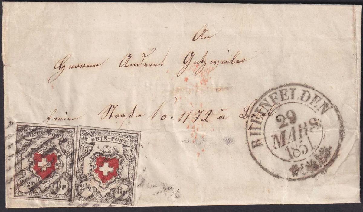 | Zusatzinformationen und Suchstichworte: | Luzernerraute Webshop Los 0000107205 Kanton Aargau RHEINFELDEN 29.MARS.1851 nach Basel, seltene 5c-Verwendung von zwei Orts-Post-Marken (Type 33+39) linke Marke vollrandig, rechte Marke unten getroffen auf bügigem Dokument, durch Registraturbug entstandenes Risschen auf linker Marke, optisch gut wirkende Frankatur, Attest Hermann (2010) SBK: 8'500.- preiswerte, seltene Frankatur aus der Zeit der Rayons (möglich wäre auch eine 5c hellblau oder dunkelblau gewesen) mit Aargauer-Raute übergehend entwertet Festpreis 1.750,00 CHF |