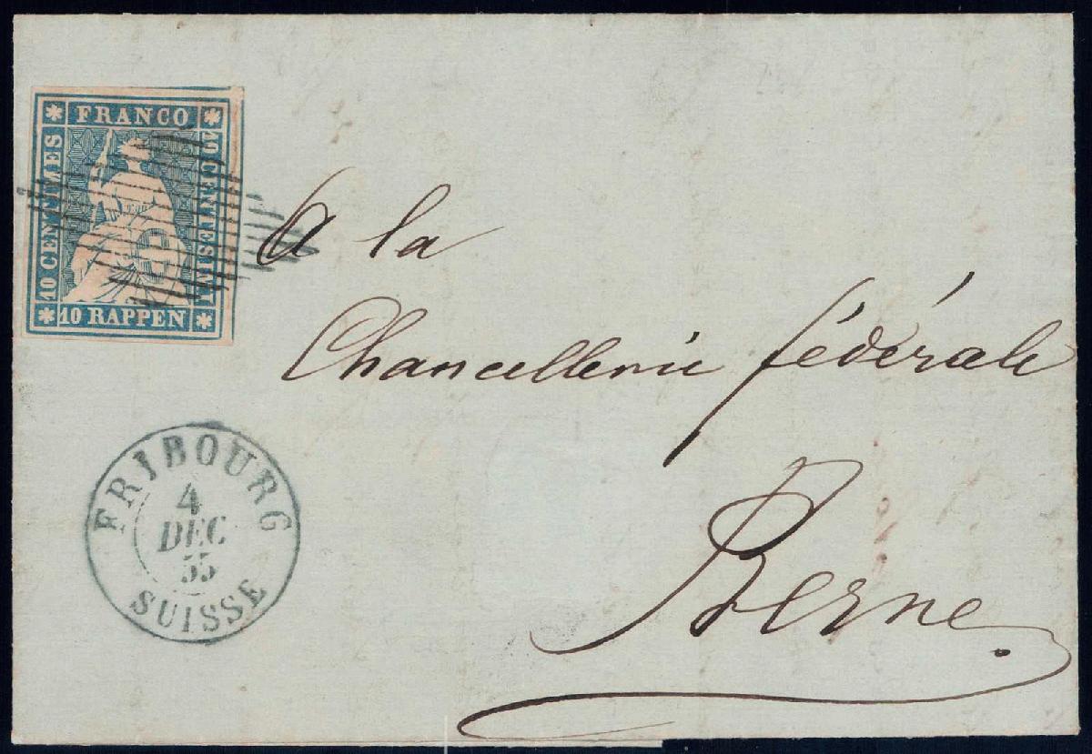 | Zusatzinformationen und Suchstichworte: | Pilatusmail Frühlingspreisliste 2024 Los 3450 Kanton Freiburg 1855, 10Rp blau, weissrandig auf sauberem Faltbrief von FRIBOURG nach Bern, Befund Marchand, 200.- Festpreis 75,00 CHF |